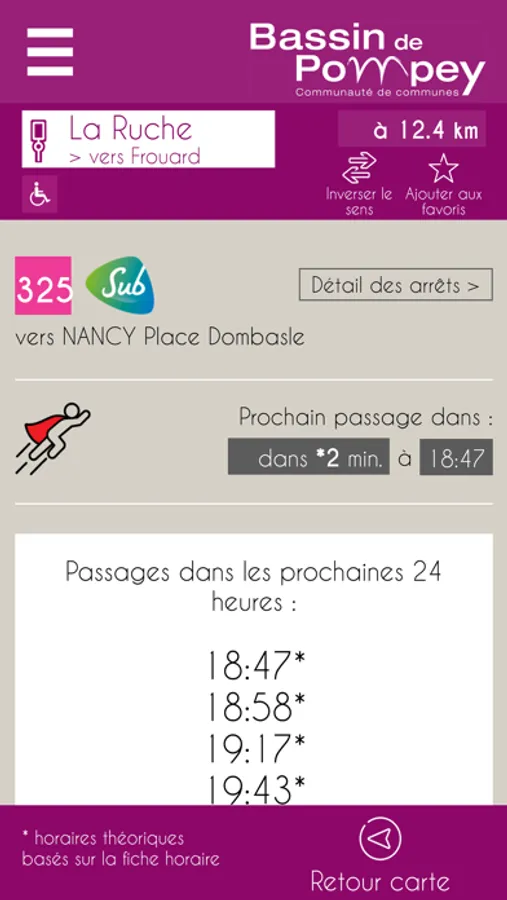 Pour plus de détails, un deuxième clic permet d'afficher la liste des prochains horaires de passage de la ligne choisie. Vous pouvez aussi sélectionner vos arrêts et les ajouter en favoris.