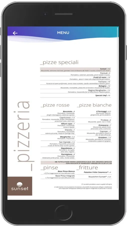Con l'app ufficiale del locale sunset, è possibile prenotare online l'ombrellone, riservare dei posti al ristorante per pranzo o cena o ordinare da bere dall'ombrellone e ricevere tutto in spiaggia. Inoltre con la sezione news/mailing list è possibile rimanere aggiornati sulle novità e sugli eventi.