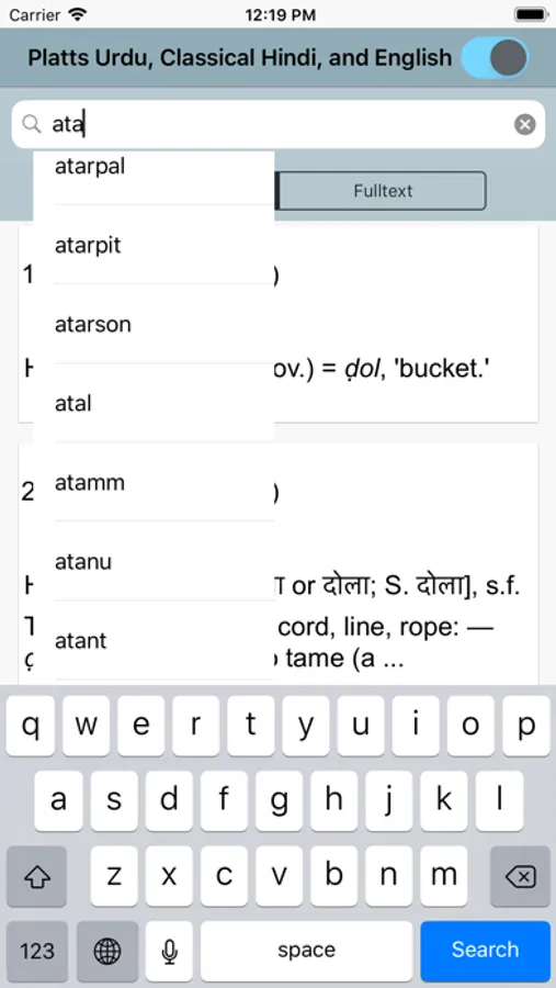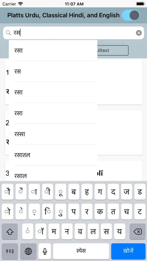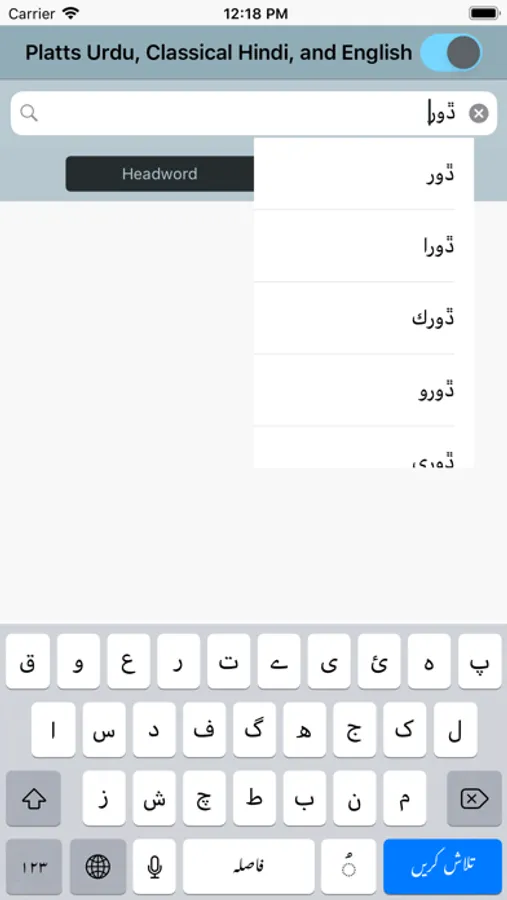 To search for a headword, touch the search bar at the top (magnifying glass icon) to expose the on-screen keyboard and begin searching. Headwords can be entered in Perso-Arabic, Devanagari, accented Latin characters, and unaccented Latin characters. For example, headword searches for ستوده, सुतोतला, sitūda, and situda all yield the definition "Praised, celebrated.”