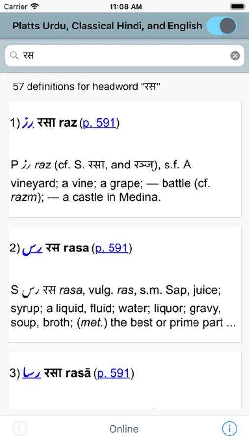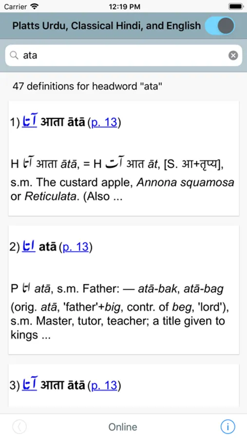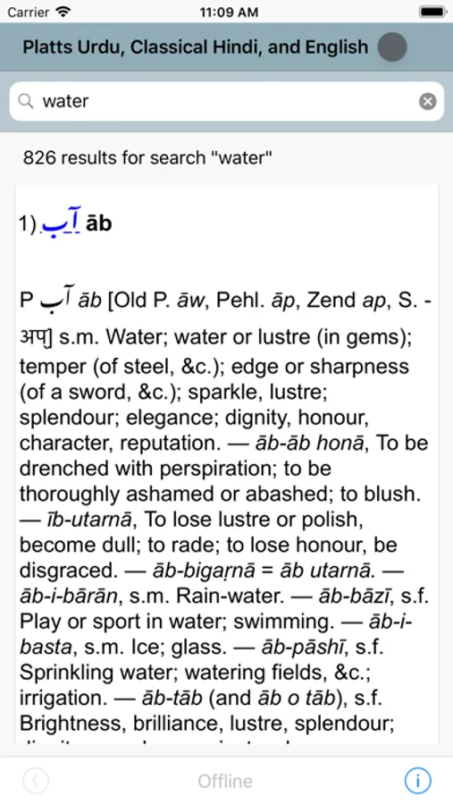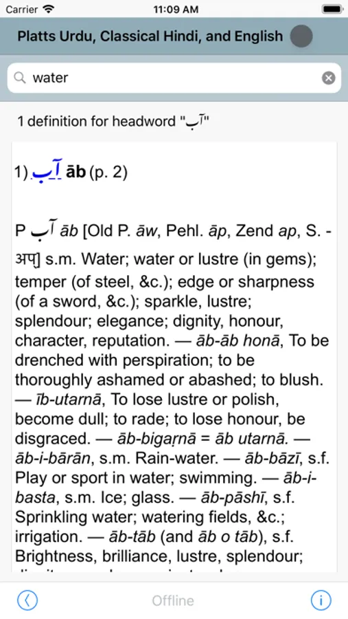 The Platts dictionary app can be used both online and offline. The online version interacts with a database that runs remotely on a server at the University of Chicago. The offline version uses a database that is created on the device upon first download.