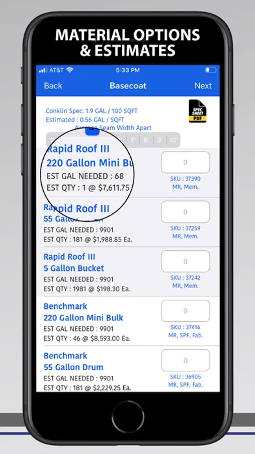 Let this App put together your estimates for you. WIth the calculated suggested quantities for Conklin materials along with easy calculators for physical labor and profit margin - this is a must have tool for keeping your business together in the busiest of roofing seasons.