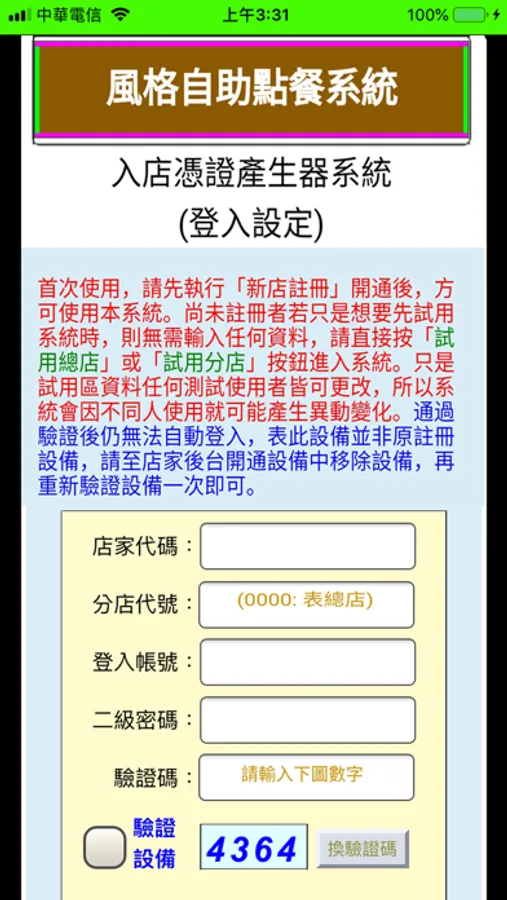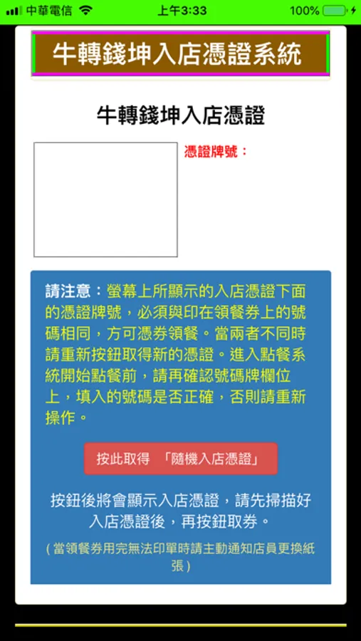 風格入店憑證產生器,提供消費者入店消費時,取淂隨機入店憑證號碼牌,以便進行點餐及領餐之用。