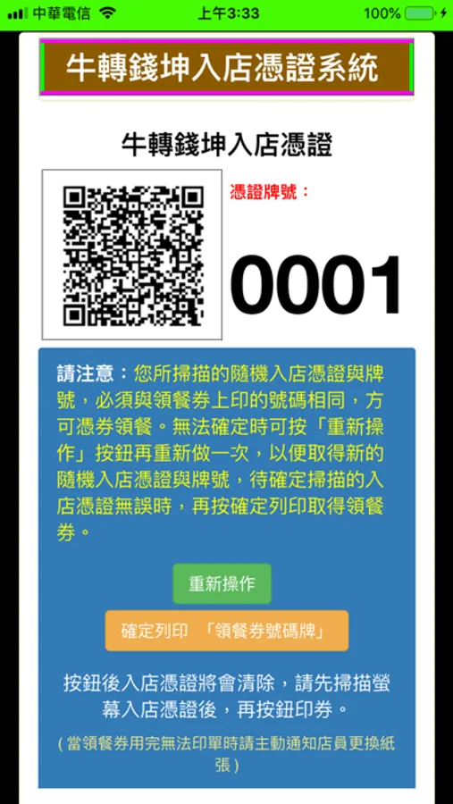 按紅色按鈕後取得隨機入店憑證號碼牌,用手機掃完 QRcode 後,再按一次橘色按紐,系統會通知出單機印出號碼牌,並清除面版上二維條碼及號碼牌,即可入店消費。