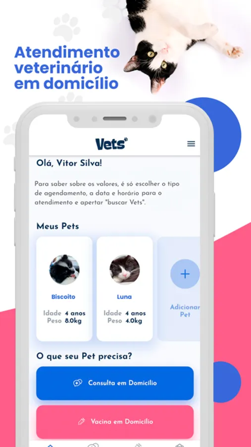 A VETS é o aplicativo que te conecta aos melhores VETS do Brasil, trazendo comodidade pra você, que não precisa sair de casa, e pro seu PET que é atendido num ambiente mais aconchegante e que já está acostumado.