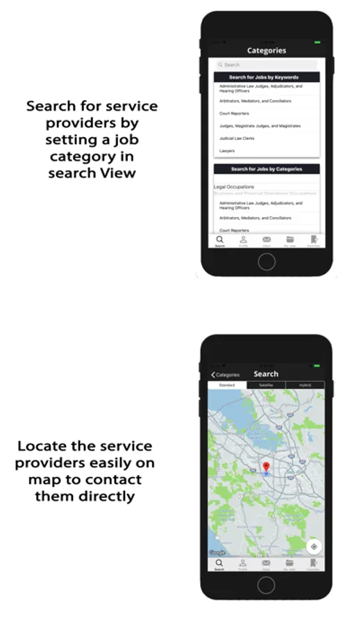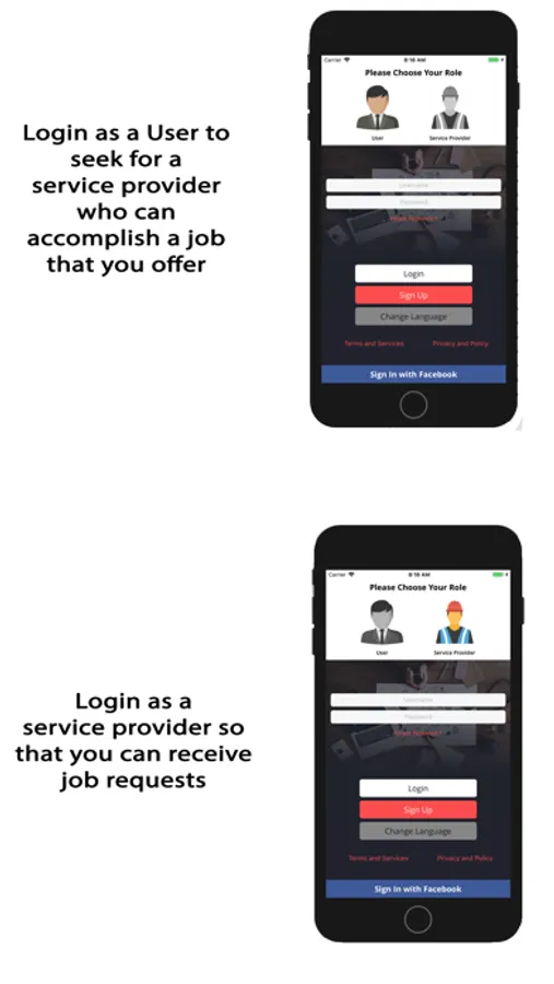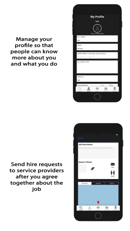 - simply signup as a user then search for service providers by choosing the category, after all the service providers will be locates on the map and you can contact them through the built in app messaging and making a deal about the job you are offering.
