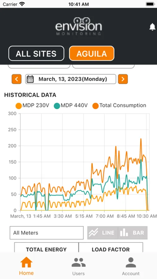 For each of registered sites, view accurate and real-time data about your facility's energy usage. Browse through your consumption graph and see the power for a specific time!