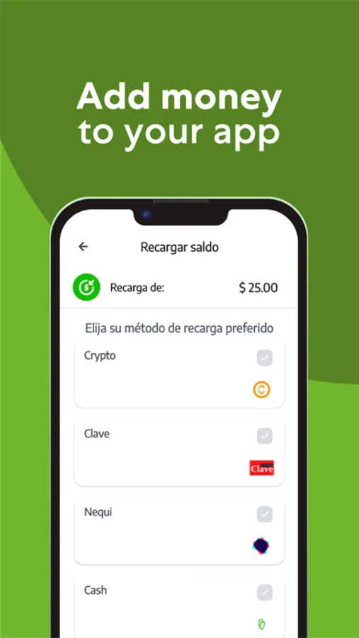 You can top up the balance of your app with Crypto, Visa or Mastercard, Cash, Clave, Nequi and ACH.