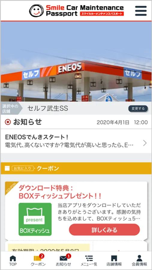 当社の公式アプリ「スマイル石油アプリ」では簡単に洗車・コーティングなどのご予約や愛車のメンテナンス管理が可能の他、当店でご利用いただけるお得なクーポンや各種メニューの割引情報を配信しております。