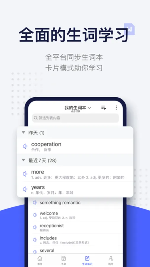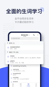 生词学习:文章中长按即可查词并加入生词本,全平台同步,更有卡片播放等复习模式助你学习;