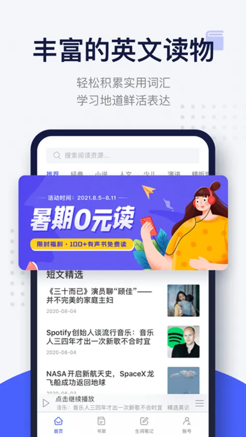 丰富的英文读物:经典名著、短篇小说、迪士尼·皮克斯电影双语阅读、少儿读物、名人演讲......原声朗读、双语字幕,带你感受原汁原味的阅读体验;