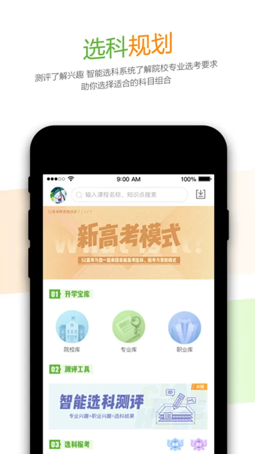 52高考 APP 联合了国内众多一线生涯规划专家及特级教师,为千万高中学子提供了更具体、更具有针对性的生涯规划、志愿填报解决方案及学习辅导服务。