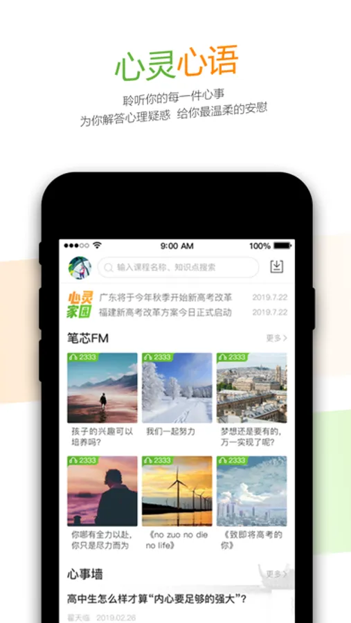 涵盖高考政策、特殊招生类名单、家长学校、教师俱乐部、学生助手等相关资讯文章,更有笔芯FM为你耳语呢喃,疏解你的学习生活疲惫。
