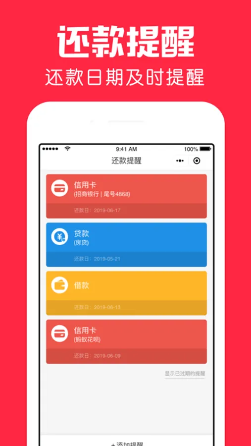还款提醒:支持信用卡还款、贷款还款等各类还款提醒