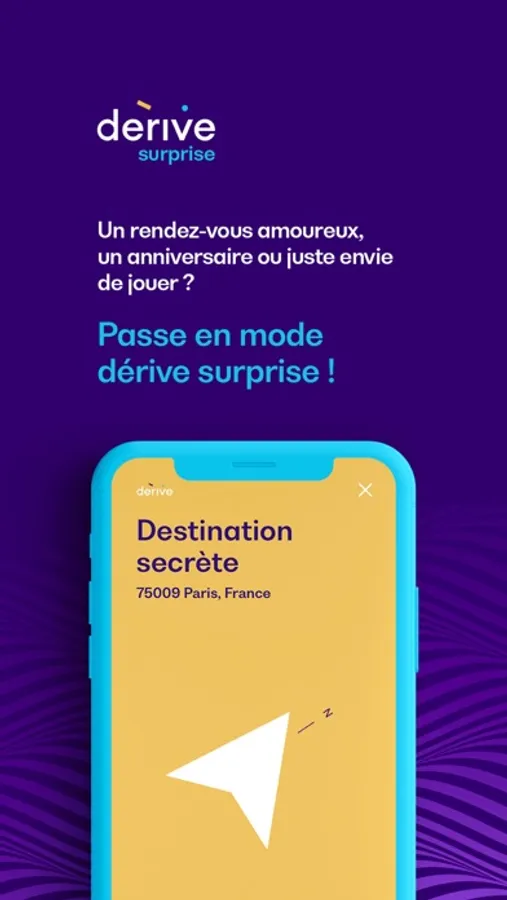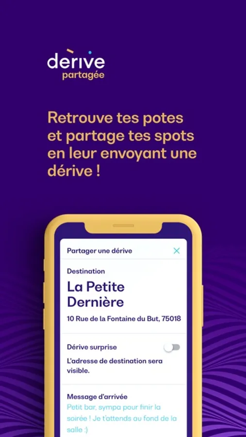 Wanna play? Share a surprise dérive with your friends by hiding the exact address from them. Let them strive to discover the spot where you are taking them. On arrival, the address and your secret message will be revealed. Ideal for a first date, a birthday party or a little thrill in your daily life!