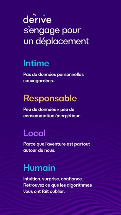- Responsible: Dérive is a lightweight application. It doesn't need to constantly optimize your journey time and display a map full of information to work. As a result, there is less CO2 emitted and less impact on your battery!