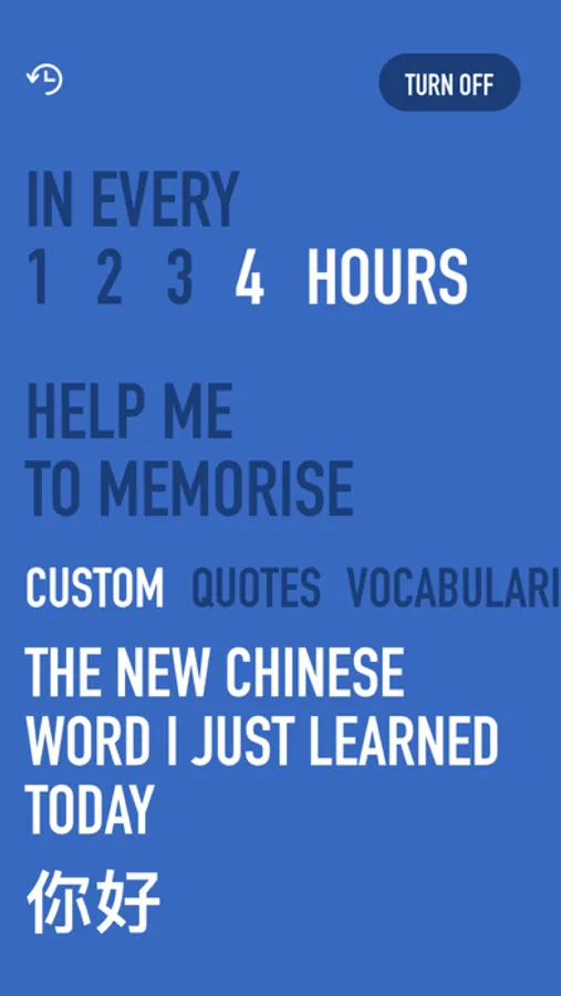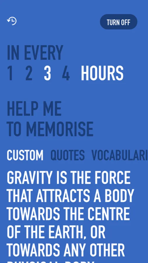 Every 1, 2, 3 or 4 hours, you will get a notification about the things you would like to memorise. It could be a new vocabulary you just learned, the text book definition of gravity, lyrics for your upcoming Karaoke competition or a great quote from Steve Jobs.