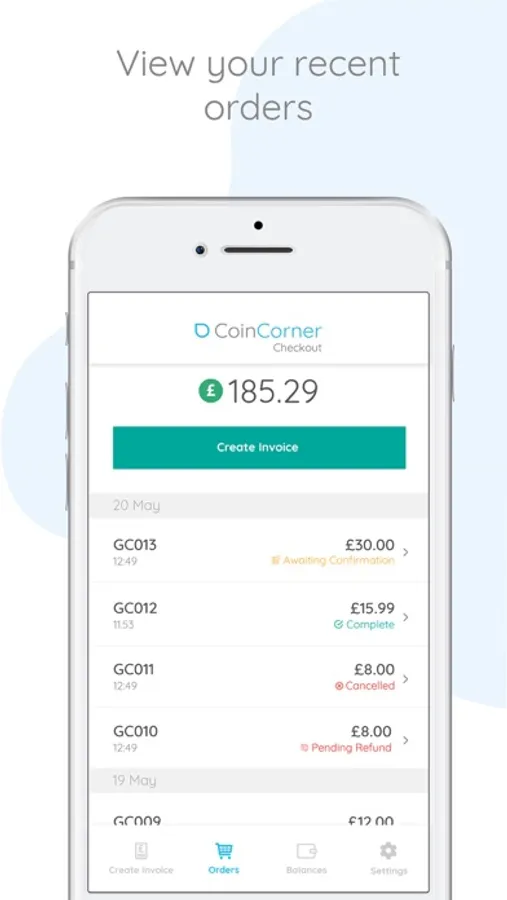 The CoinCorner Checkout app lets you access your business account on the go to create invoices, manage orders, check account balances and handle refunds easily.