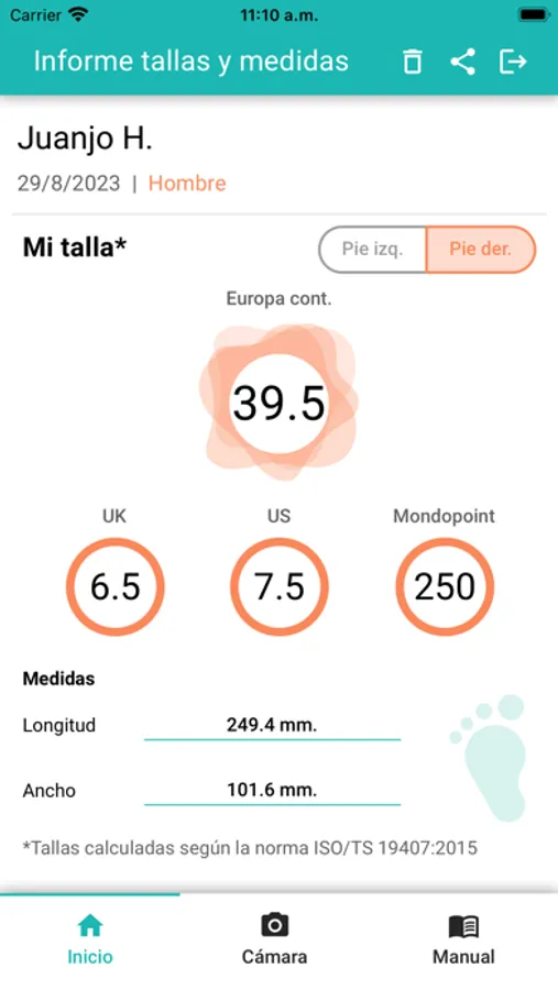 The usage of INESCOP YourFeet is fast, simple and intuitive, and the accuracy of the measurements it provides is adequate. This measurement is based on taking photographs of the feet from a lateral and upper perspective. Additionally, an a-4 paper sheet is used as a reference for converting the dimensions extracted from the pictures into real world measures. These dimensions are the foot length, and optionally, the foot width. Measurements are stored in the device and can be viewed later. The application also calculates the user´s foot size in the Continental (European), British (U.K.), American (U.S.) and MondoPoint systems, by using the technical specification defined in ISO/TS 19407.