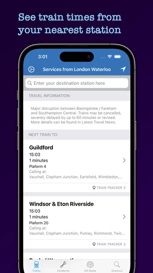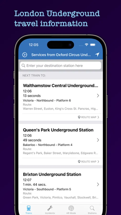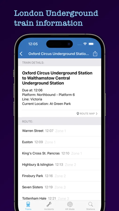 Picture real-time train information in an interactive real-world environment. See nearby trains*, railway stations and London Underground stations in an immersive augmented reality experience. The app will locate trains that are departing from your nearest station and display them. Tapping on a train reveals more information about its calling points and last reported location. AR mode is available on iOS 13 or higher.
