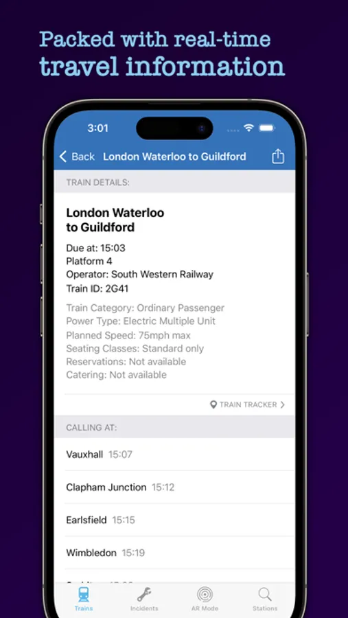 The app can report times from intermediary passing points such as junctions, providing you with a high level of precision and accuracy about the current status of a given train’s journey. Packed with detailed train information like number of carriages, train category, power type (eg EMU), timing load (eg Class 323), planned maximum speed (eg 90mph max), seating classes, reservations, catering, and operating characteristics (eg DOO). This information is only available if data has been supplied by the TOC. Some TOCs don't supply carriage data. The app can also show the calling point times and route map for London Undergound trains, if this data has been supplied by TfL.