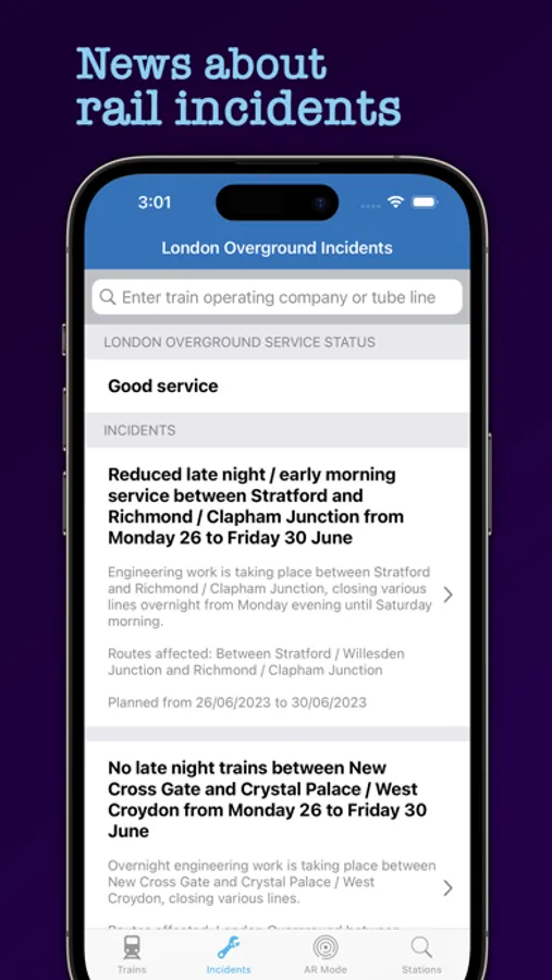 Easily see information about the service status and news about rail incidents and current / future maintenance. The incidents screen includes information such as the incident details, routes affected, date/s of incident and direct links to the relevent National Rail Enquiries page and map, where available. Includes London Underground service status and incidents.