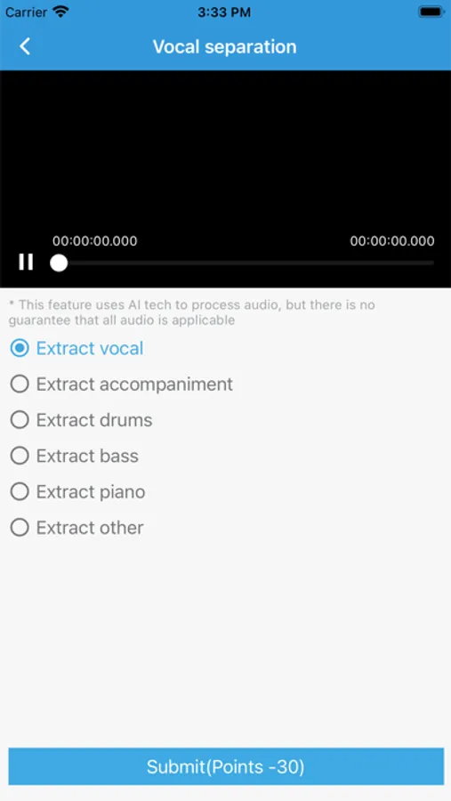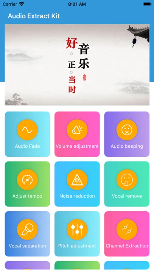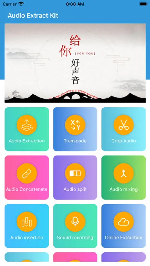 The app includes functions such as online extraction,audio extraction,transcode,format coversion,croping,concatenate,split,mixing,voice msg export,fade,volume adjustment,beeping,change tempo,noise reduction,vocal remove,change pitch,extract channels,merge channels,surround sound,audio tag and album cover,audio reverb, Lyrics editing,make ringtone.