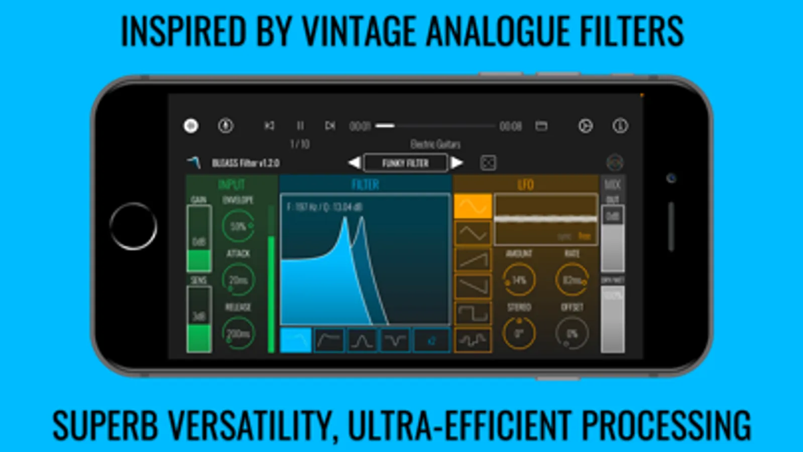 The large on-screen graph gives an accurate readout of the filter’s current setup, and also allows you to change that setup: drag left and right to alter the cutoff frequency; drag up-and-down to increase or decrease the filter resonance.