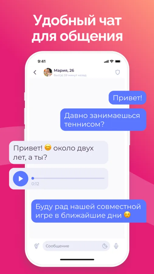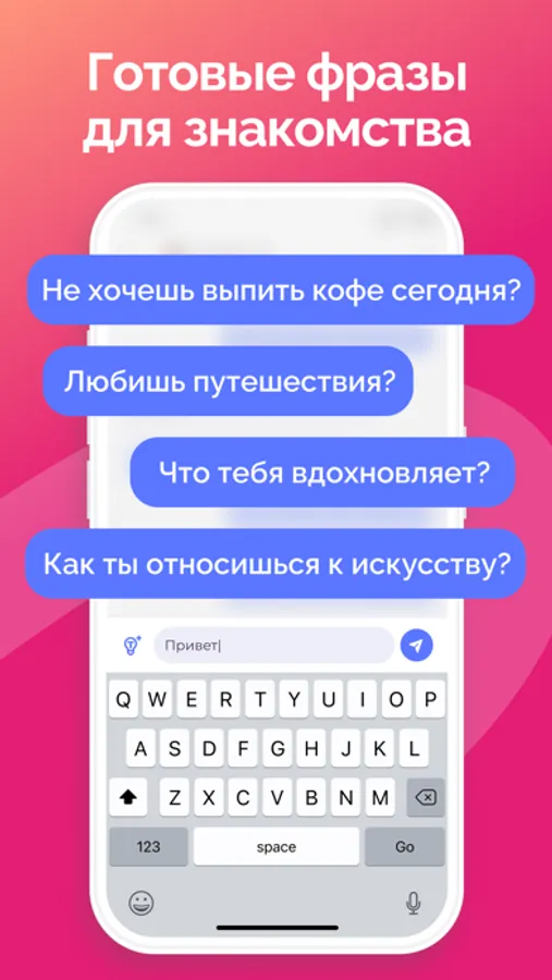 Согласно открытым данным, более 85% пользователей сервисов знакомств стесняются написать первым. Мы решили и эту проблему. В приложении есть встроенный фразогенератор из отборных фраз для старта коммуникации.