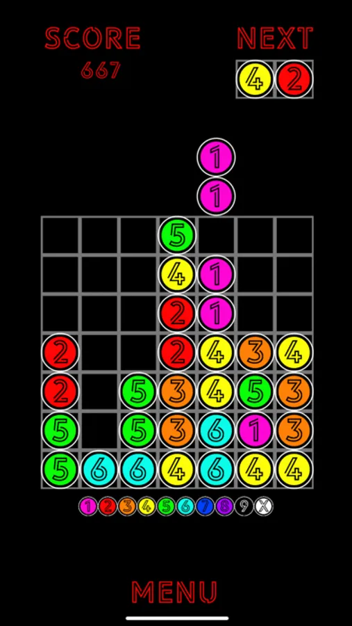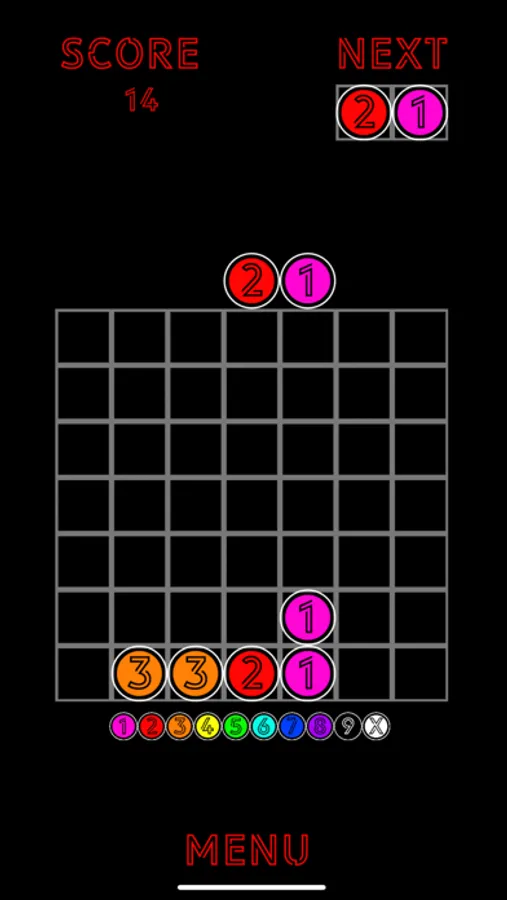 Merge is a puzzle arcade game. With a 7 x 7 board and 10 colors, the player is given 2 colors each turn. The player may rotate and move these 2 colors how they like and drop them into the board. The player is shown what the next 2 colors will be. When 3 colors are connected (vertically, horizontally, or adjacently) they will all disappear and transform into the next color in the sequence (shown at the bottom of the game board). The player is shown what the next two colors will be, this can often change the plan for the current two colors.