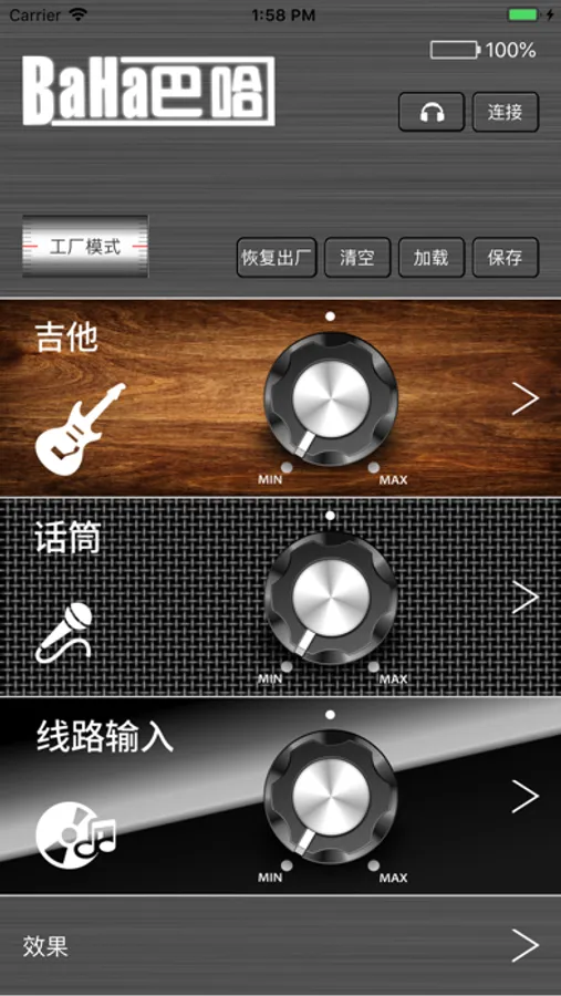 金色天籁,声声似金,这是一个通过蓝牙连接控制音响的APP,通过这个APP,你可以更改吉他、话筒和音乐通道的音量等功能,包括切换各个模式、录音、更改各种效果等功能。没有做不到,只有想不到。