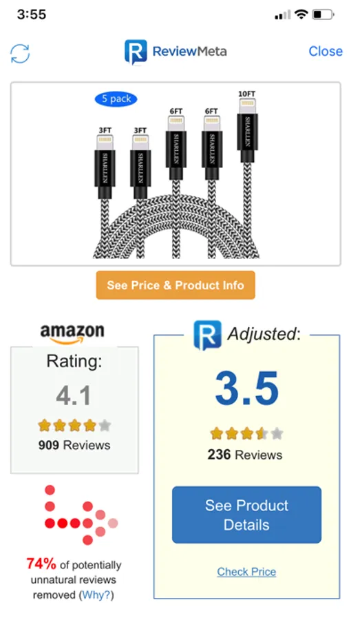ReviewMeta is a free app that analyzes Amazon product reviews and filters out reviews that look suspicious or unnatural, giving you an "Adjusted Rating" that shows you what real, unbiased shoppers truly think of the product... a rating you can trust.