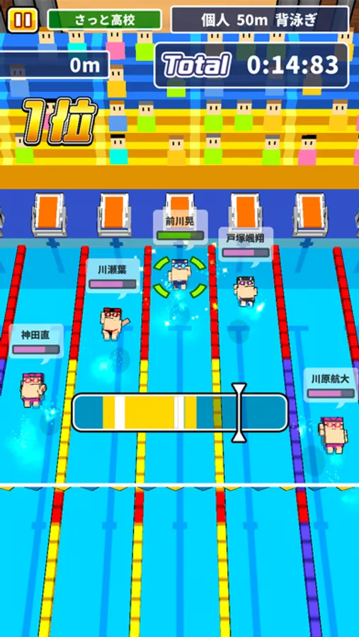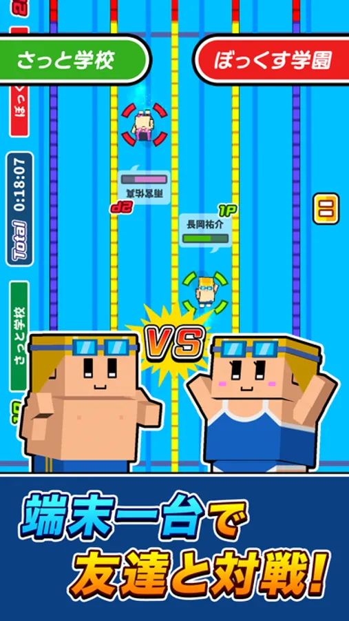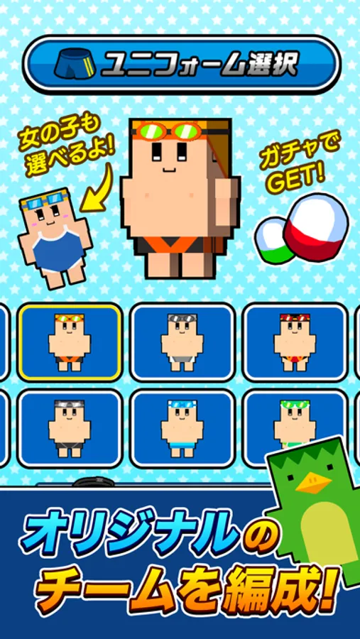 かわいいキャラたちが、メドレーをはじめ、自由形・平泳ぎ・背泳ぎ・バタフライを完全再現!