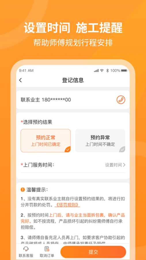 【日程安排】:师傅设置好施工时间后,施工前可收到施工通知,帮助师傅更好的规划行程安排;