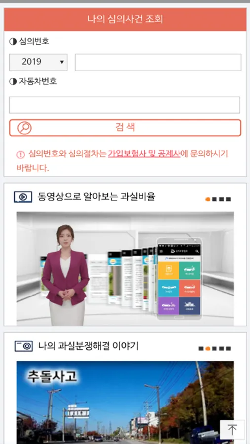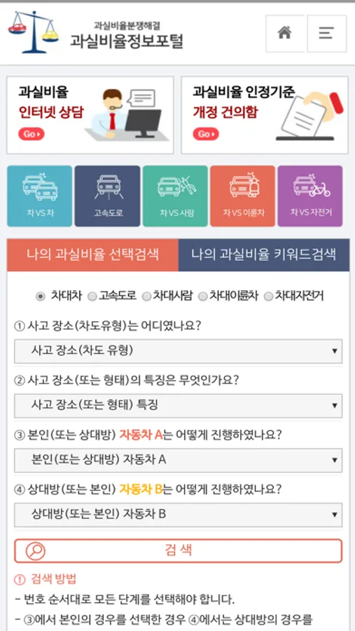 사고유형(차대차, 차대사람 등 선택) - 도표를 대표하는 핵심 단어, 키워드, 검색어 등을 입력하여 검색 - 본인사고에 맞는 도표 및 기본과실 확인