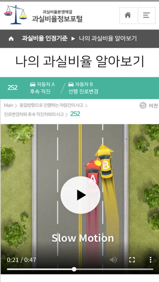 - 교통사고 발생시 가해자와 피해자의 책임정도를 나타내는 과실비율에 대하여 법원 판례, 법령, 분쟁조정사례 등을 참고로 만들어진 국내 유일의 공식기준입니다.