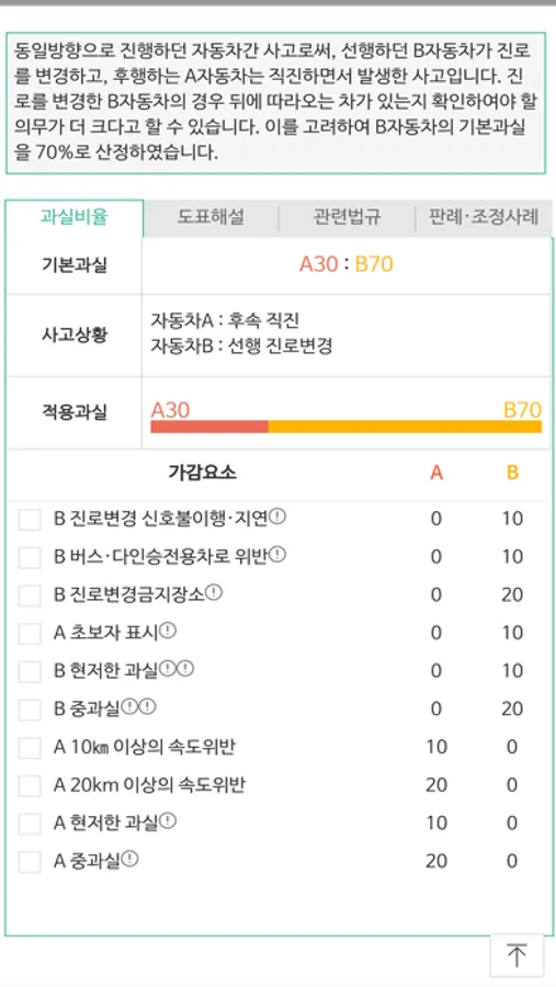 사고유형(차대차, 차대사람 등 선택) - 사고장소(차도유형) 선택 - 사고장소(또는 형태) 선택 - 본인(또는 상대방) 주행경로 선택 - 상대방(또는 본인) 주행경로 선택 - 본인사고에 맞는 도표 및 기본과실 확인