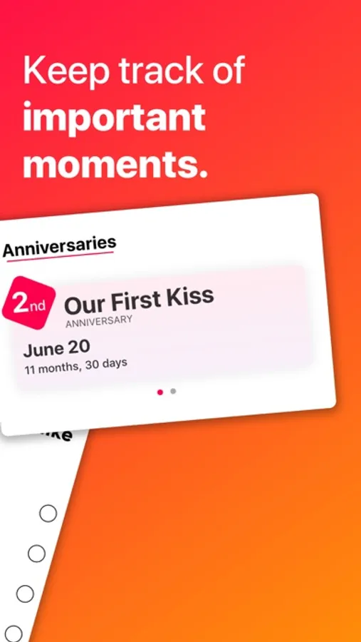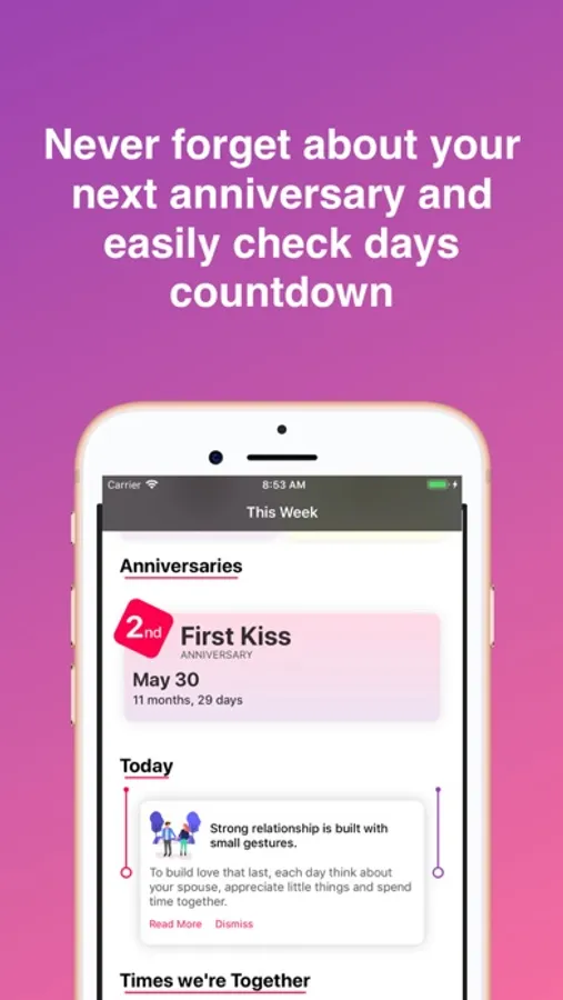 * Keep track of your anniversaries. Just take a glance at the Next Anniversary Countdown and never forget about your special day.