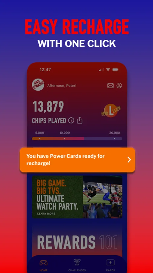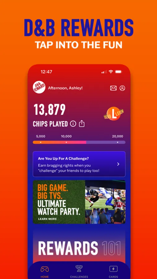 Download FUN & Rewards straight to your phone with the new Dave & Buster’s app! D&B Rewards is bigger & better with a whole new look and new ways to earn rewards. LEVEL UP and create your D&B Rewards account in the app and start earning benefits: