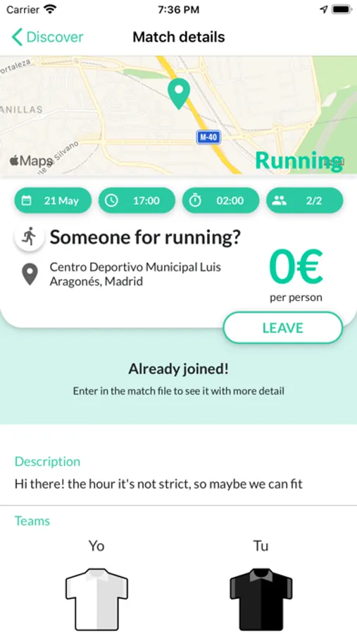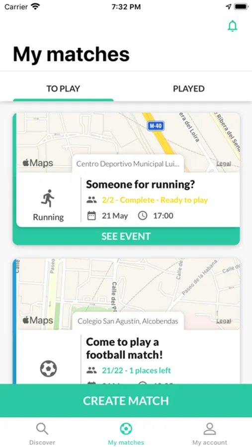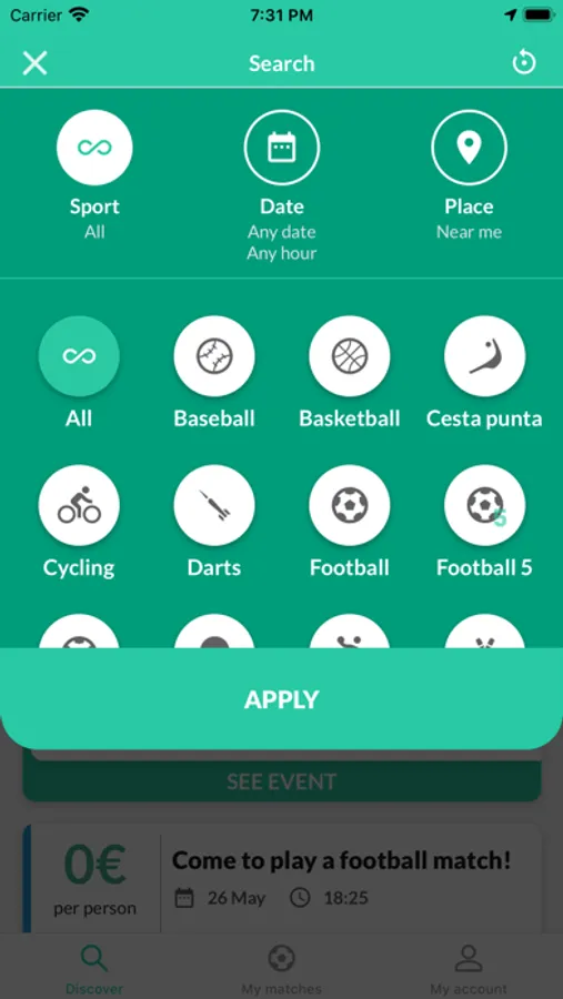 ¿Do you like going out on a bike or running, but are you bored of doing it alone? Organize or join sporting events easily. Find opponents for playing a football match against your friends and you, or search for mates to go out running. Filter by sport, location or date and find your ideal event.