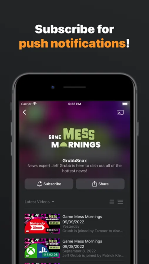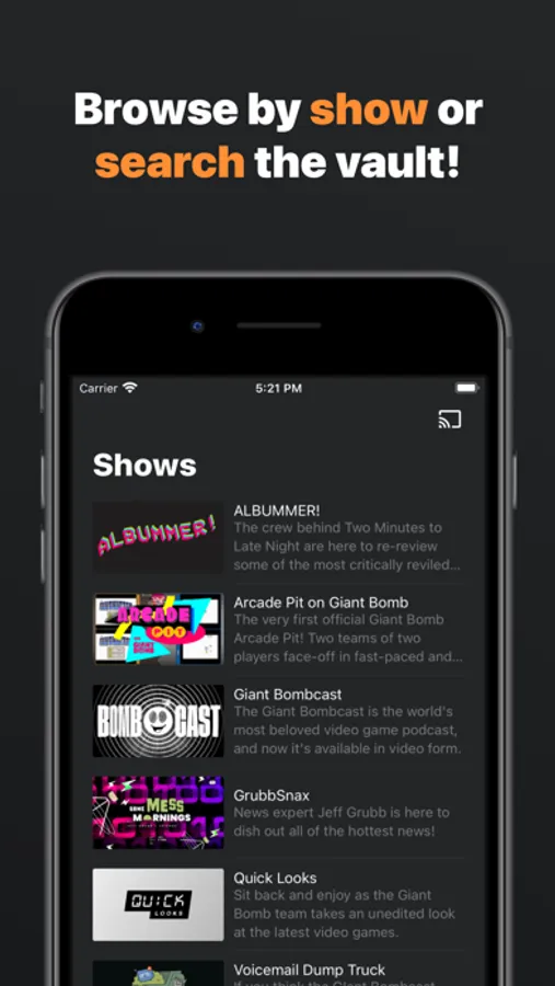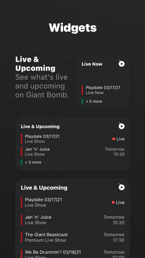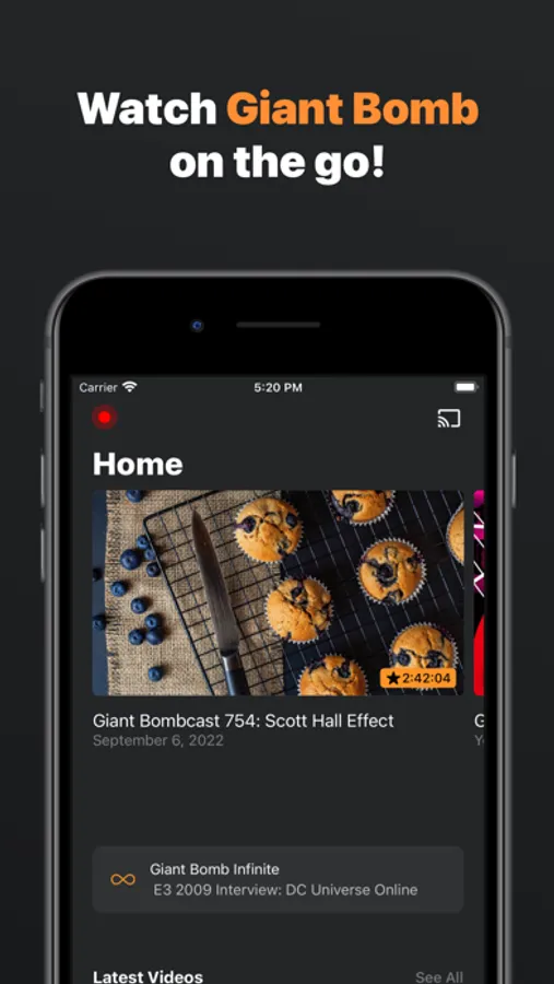 Watch Giant Bomb on the go. Get notifications for new episodes and livestreams. Watch on your TV using Airplay or Chromecast. Pick up where you left off with the Continue Watching widget, and stay up to date with the Live & Upcoming widget.