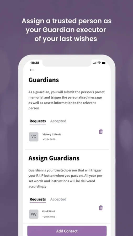 Upon your after life, iLastWord will publish your preset Memorial and inform your assigned Guardian of your last wishes and instructions (think: your last words and wishes, literally), including any digital funeral services (think: Green Burial), preset last words to your loved ones, and identification and assignment of your Assets to your intended Beneficiaries via the Assets-Beneficiary function
