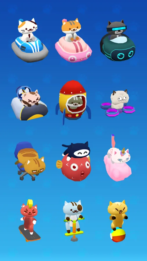 Each cat has a unique ride ; cars, pogo stick, skate board, UFO, Tanks... you name it.