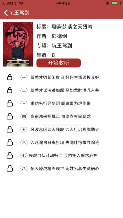 坑王驾到收录全部评书,目前包括《聊斋梦谈之天残岭》,《康熙私访月明楼》,《卿卿误我》,《张小乙下南京》,《你好妖怪》,《九头案》等等。后续还将实时更新一系列的单口相声,欢迎下载试听
