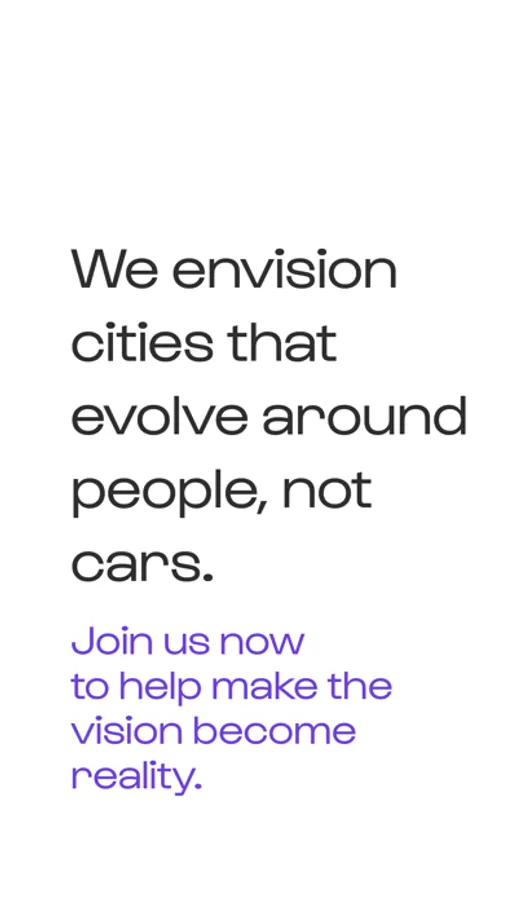 We envision cities that revolve around people, not cars. Imagine what your city would look and feel like with half the number of cars on the road. Better air, less noise, and more space for humans, trees – and dogs! We believe that we can make this a reality, together.