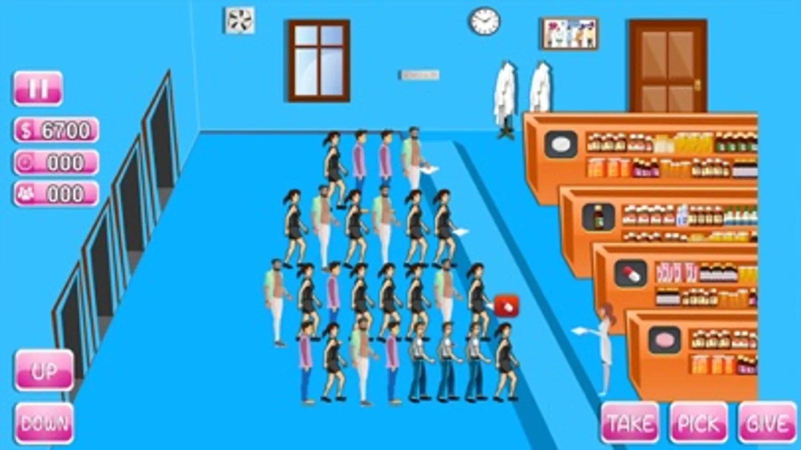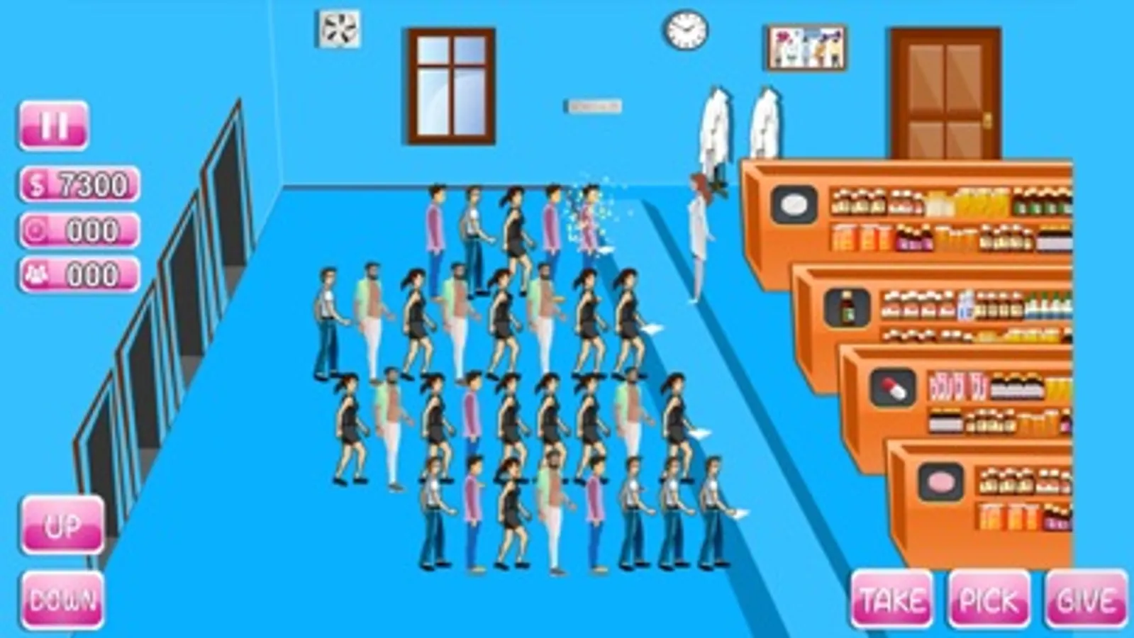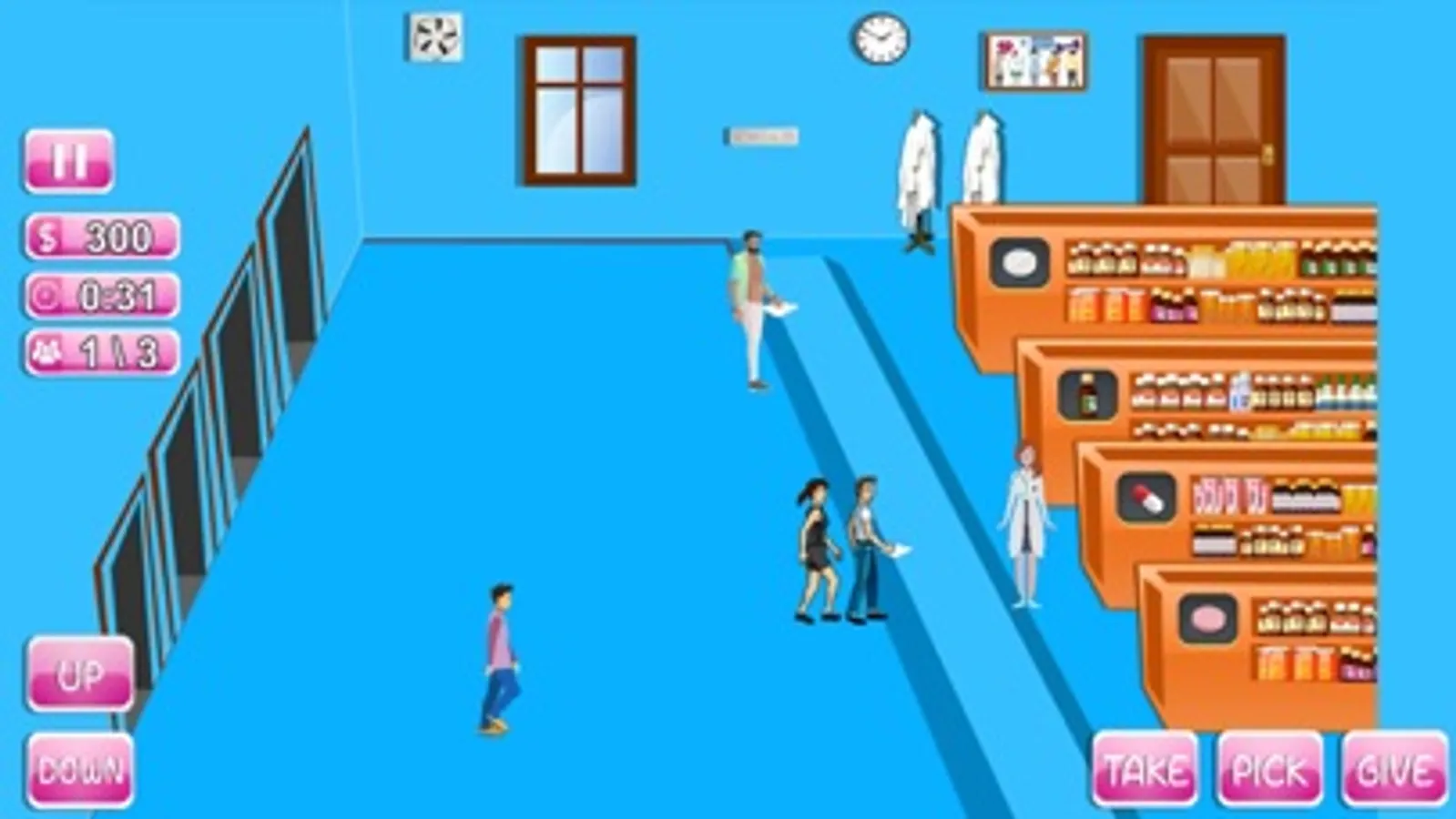 Your patients are in need of medication. Get behind the pharmacy counter and fill their medical prescriptions as fast as you can. Use the buttons UP and DOWN to move the pharmacist at the drug store and press TAKE to grab the prescription, PICK to learn, find and get medicine from the respective isle and GIVE button to hand the medicine to the customer.