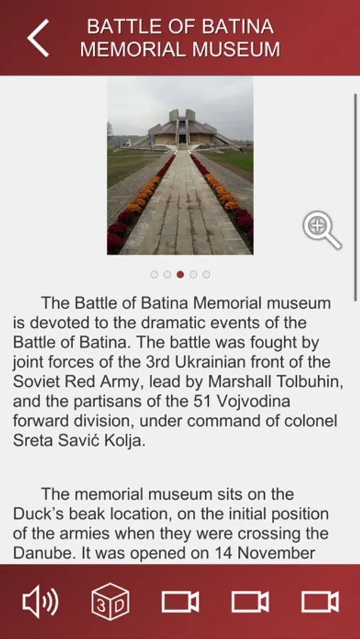 The application is developed for the Battle of Batina Memorial museum. Multimedia formats, VR and AR modules are implemented to provide more immersive content of museum.