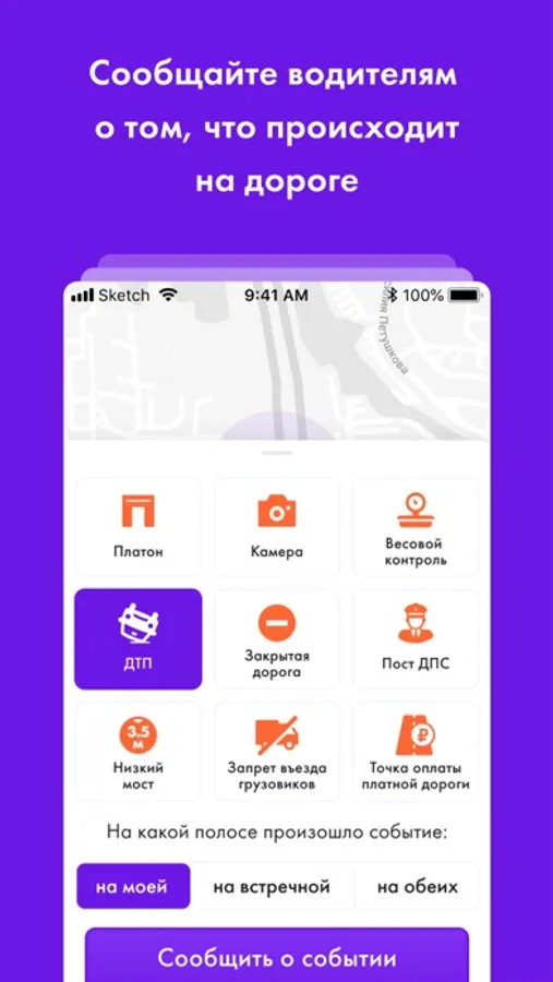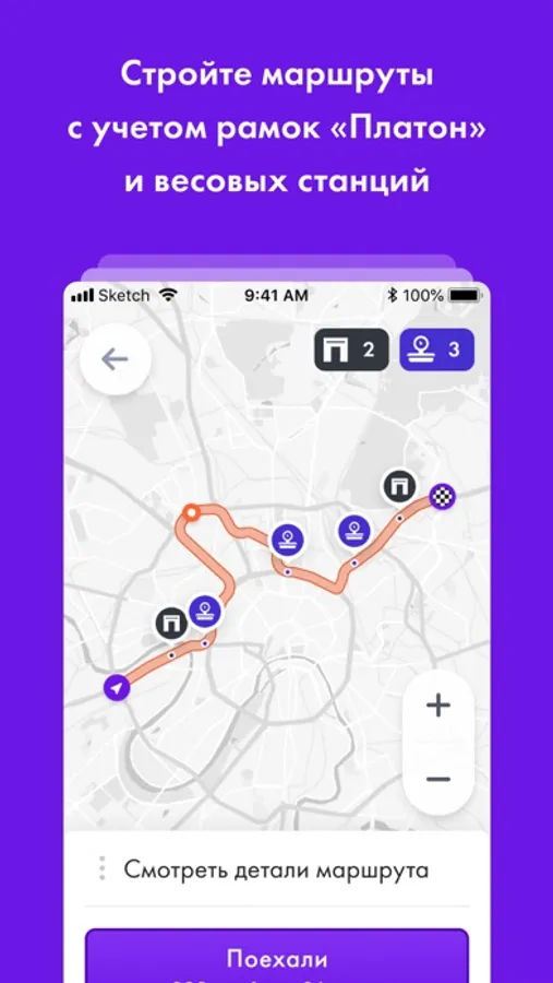 • Приложение показывает на маршруте рамки системы «ПЛАТОН» и предлагает альтернативные варианты проезда.