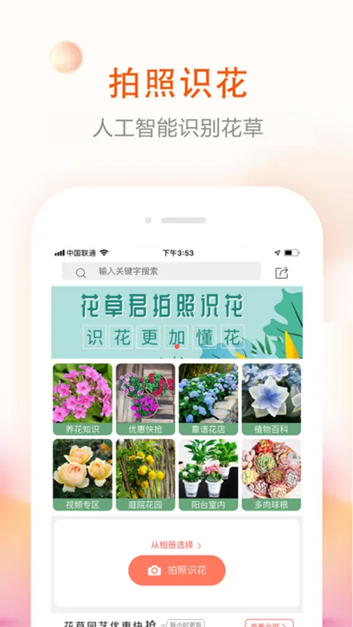 花草君是一款集 拍照识花、植物大全、靠谱店铺、花卉园艺、优惠快抢等内容于一体的拍照识花君APP.让爱花的人不但可以利用先进的人工智能技术识别花草,还可以学习多肉植物花卉园艺知识,网上购买价格更便宜的花卉、园艺、多肉植物等等商品。