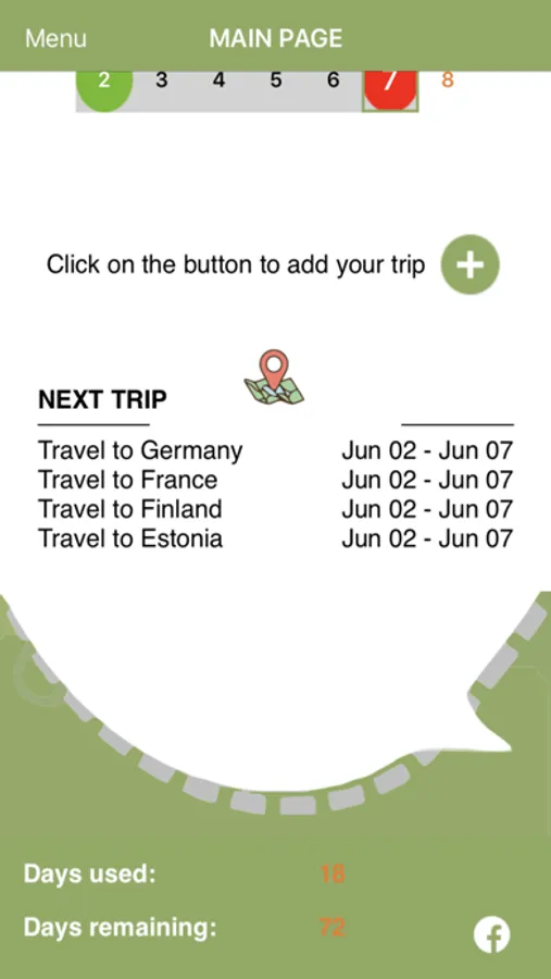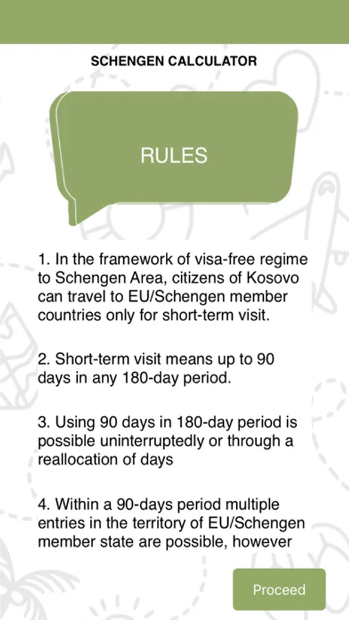 The aim of the KS Schengen Calculator is to calculate travel days to the Schengen area and give app users recommendations according to regulations of visa free travel regarding the number of days remaining for a legal stay within the Schengen zone. The application determines how many days have been used of 90 eligible days out of the last 180 days.