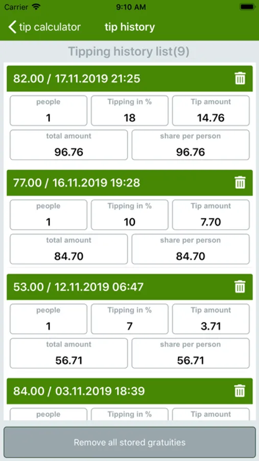 And this works also for a total bill amount, if you five were traveling. Depending on how you want to pay, together or individually - do not waste any time with awkward arithmetic tasks and use our tips app, so everyone receives promptly to pay his bill and in addition the appropriate tip for the service.